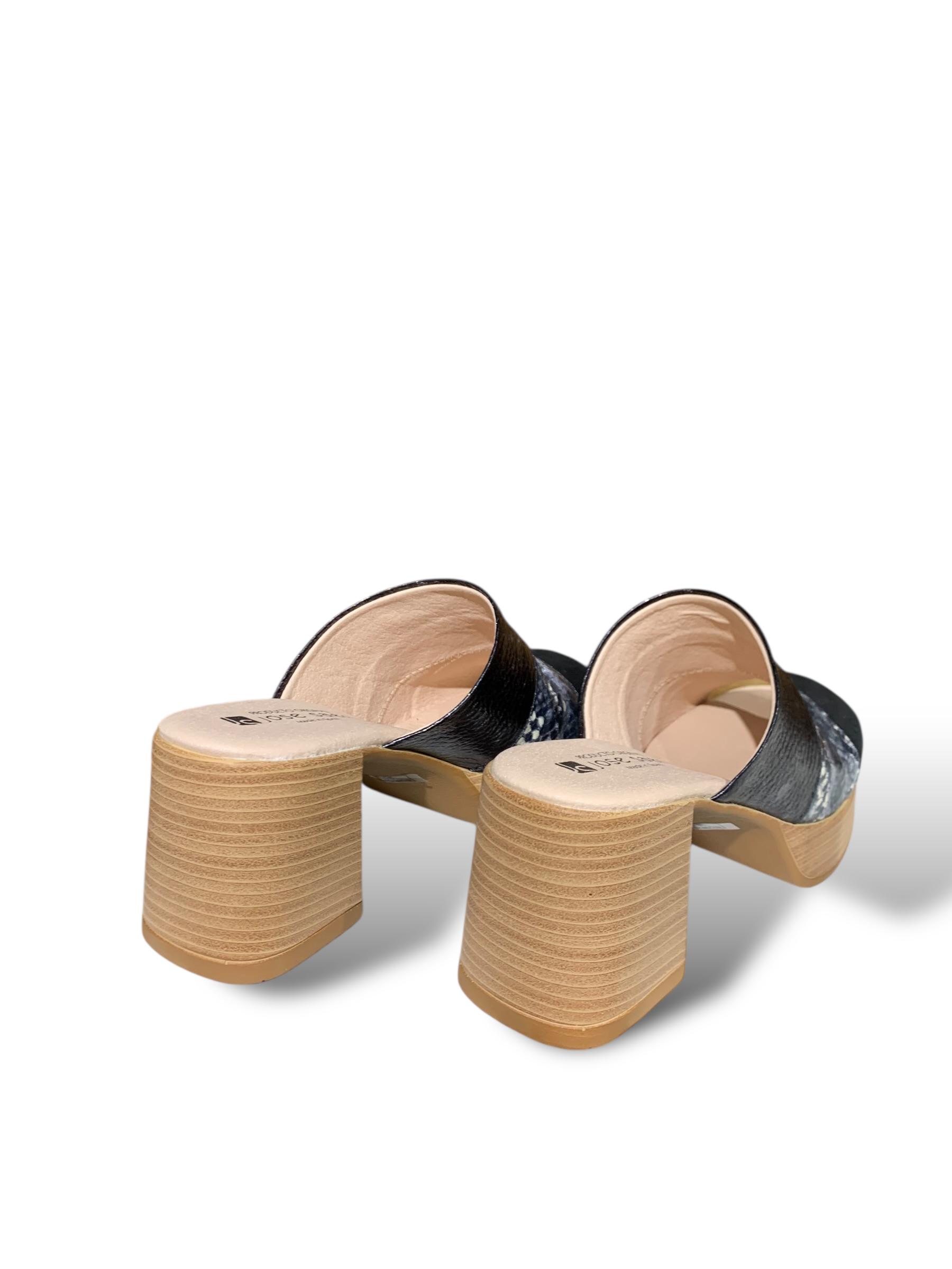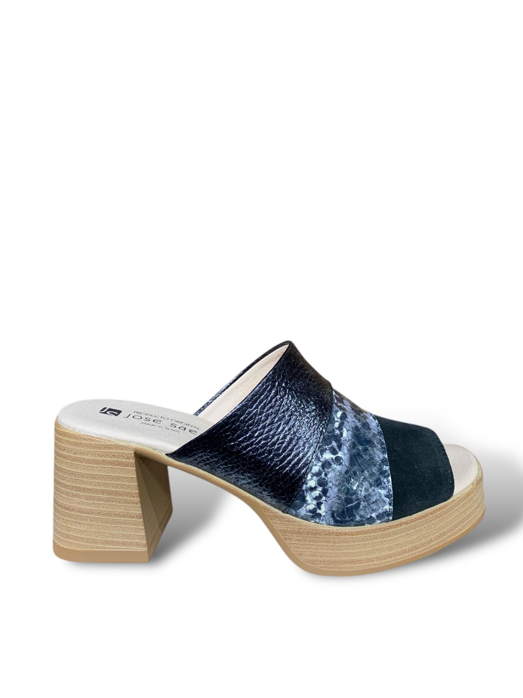 SANDALIA DE CUERO, INCLUIDA CAPELLADA, EN TRES TEXTURAS Y DISEÑOS EN BASE COLOR NEGRO.